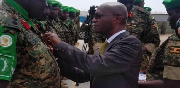 Amb.Nathan Mugisha, decorates a medal to the outgoing Battle Group XXIII Commander, Col Okolong. Looking on is Brig. Paul Lokech outgoing Contingent Commander .